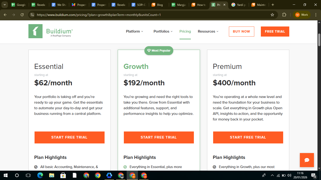 Starts at $62/month for up to 20 units, (Growth plan); scales to $192/month for unlimited units, (Premium plan) to $400/month plus per-unit fees.