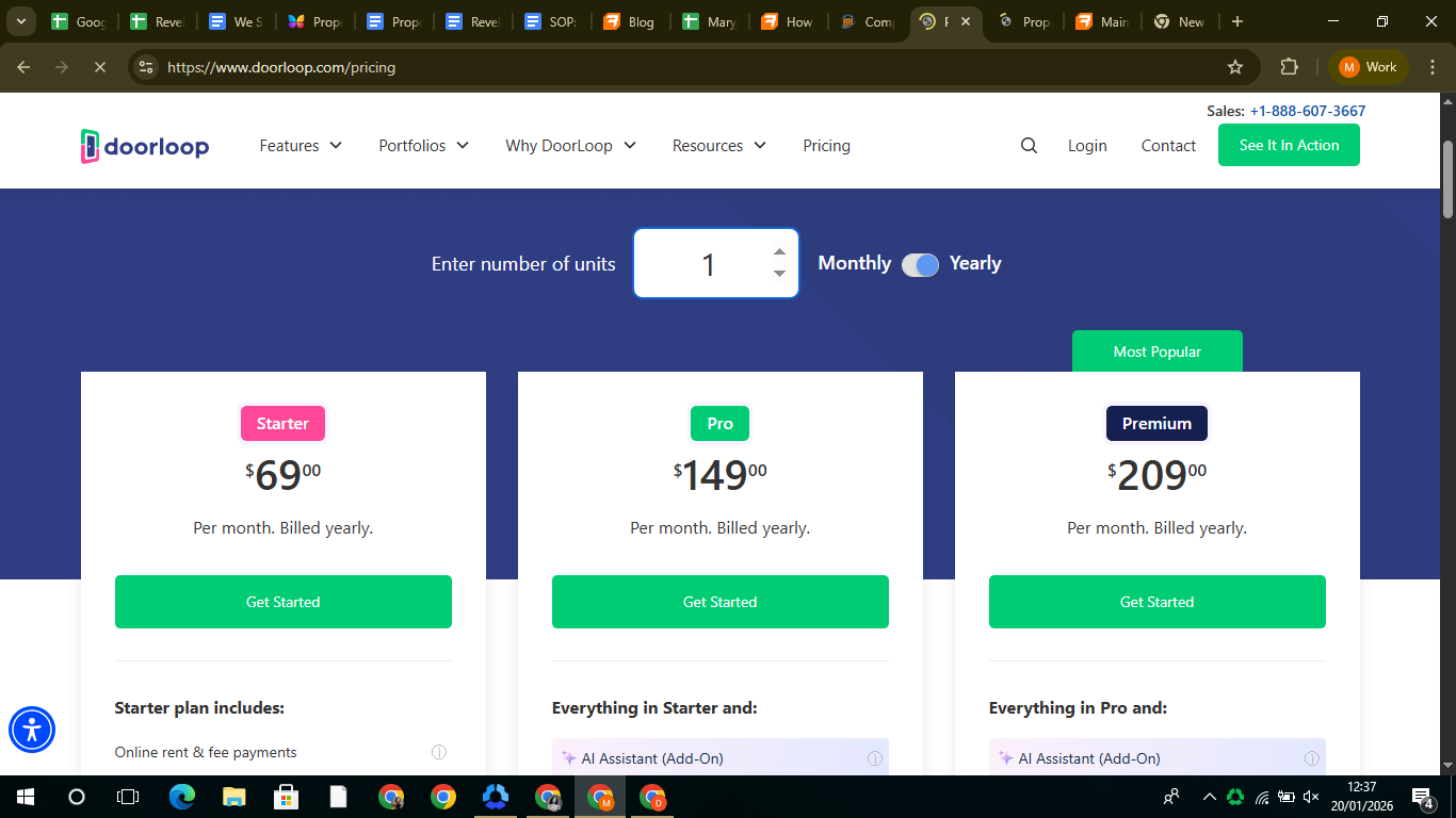 DoorLoop’s pricing starts at around $69 per unit/month (Starter), $149 per unit/month (Pro), and $209 per unit/month (Premium) when billed annually, with slightly higher rates if billed monthly.